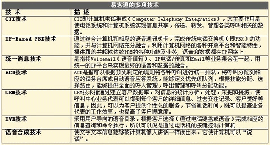易客通是以客戶(hù)關(guān)系管理為核心的具有融合通信功能的呼叫中心,是企業(yè)(或機(jī)構(gòu))內(nèi)外交流的門(mén)戶(hù),是企業(yè)(或機(jī)構(gòu))連接互聯(lián)網(wǎng)、局域網(wǎng)和電話(huà)網(wǎng)的樞紐。