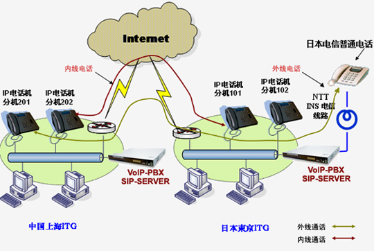 上海愛(ài)吉研發(fā)的VoIP-PBX軟交換系統(tǒng)已經(jīng)成功地在上海愛(ài)吉和日本愛(ài)吉以及日本的客戶間實(shí)施。目前應(yīng)用上海愛(ài)吉生產(chǎn)的VoIP-PBX產(chǎn)品,可以實(shí)現(xiàn)從上海愛(ài)吉的任意IP電話機(jī)撥打內(nèi)部分機(jī)號(hào),例如:101,成功實(shí)現(xiàn)從Internet互聯(lián)網(wǎng)接通位于日本東京的日本ITG或日本OKI公司的IP電話機(jī),而不產(chǎn)生任何的電信費(fèi)用。另外,目前通過(guò)日本的NTTINS 交換機(jī),還實(shí)現(xiàn)了從上海愛(ài)吉的IP電話機(jī)可以撥打日本方面的任意普通電話,即日本電信范圍內(nèi)的任意普通電話,而僅僅產(chǎn)生從日本ITG到日本其它地方的短途或國(guó)內(nèi)長(zhǎng)途費(fèi)用,而沒(méi)有上海到日本的國(guó)際長(zhǎng)途費(fèi)用。具體的網(wǎng)絡(luò)應(yīng)用圖如下所示: