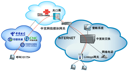 企業(yè)或個人自行從網(wǎng)站上成功申請“企業(yè)商務通”或“個人隨身行”業(yè)務后,通過101756*全國統(tǒng)一接入號結合中寬網(wǎng)信推薦的思科linksys網(wǎng)關或網(wǎng)絡電話使用,當外部對您申請的10175*號碼發(fā)起呼叫時,該呼叫通過中國聯(lián)通的線路將話務指向中寬網(wǎng)信的媒體網(wǎng)關,由中寬軟交換平臺將呼叫送至您指定的電話上。另外,當您使用該業(yè)務外呼時,可以選擇在被叫電話上顯示10175*或隱藏號碼。