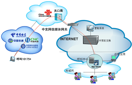 企業(yè)自行從網(wǎng)站上成功申請“企業(yè)商務通”業(yè)務后,通過101756*全國統(tǒng)一接入號結合呼叫中心,當外部對企業(yè)申請的10175*號碼發(fā)起呼叫時,該呼叫通過中國聯(lián)通的線路將話務指向中寬網(wǎng)信的媒體網(wǎng)關,由中寬軟交換平臺將呼叫送至指定的呼叫中心,由呼叫中心完成相應的服務。另外,當您使用該業(yè)務外呼時,可以選擇在被叫電話上顯示10175*或隱藏號碼。