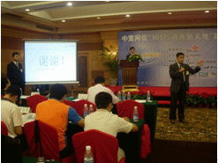 2007年8月15日下午,中國(guó)聯(lián)通、中寬網(wǎng)信"10175商務(wù)新天地"新產(chǎn)品全國(guó)巡展成都站在家園國(guó)際酒店順利召開(kāi)。此站是這次全國(guó)巡展活動(dòng)的第六站。成都站會(huì)議得到了中國(guó)聯(lián)通的大力支持,中國(guó)聯(lián)通數(shù)固部張宇、中國(guó)聯(lián)通四川分公司數(shù)固部副總經(jīng)理彭總、中國(guó)聯(lián)通四川分公司數(shù)固部鐘宇及中國(guó)聯(lián)通的各級(jí)代理商出席此次會(huì)議。