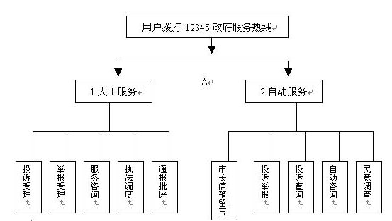 當用戶撥通"12345"電話并選擇自動服務(wù)時,聲訊臺自動播放引導語"選擇市長信箱留言請按1,自動投訴舉報請按2,投訴查詢請按3,服務(wù)咨詢請按4,民意調(diào)查請按5。