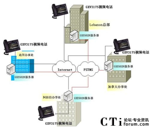 在Tabbara公司的全球四個辦事處分別安裝潮流網(wǎng)絡的GXE5028 IPPBX服務器或者其他的SIP Sever通信平臺,GXE5028 IP PBX支持語音信箱,郵件和其他通信功能應用,每一臺GXE5028最大限度地支持分布全球辦事處的所有通信賬號同時連接到同一網(wǎng)絡中,終端連接IP電話,IP視頻電話以及IP視頻監(jiān)控攝像機作為語音/數(shù)據(jù)的輸入輸出,當然IP PBX也可通過網(wǎng)絡連接到VoIP服務器中間位置的SIP中繼。潮流網(wǎng)絡的GXV3175多媒體觸摸屏視頻電話,支持標準的SIP協(xié)議,先進的H.264/H.263/H.263+視頻壓縮標準,寬大的7寸彩色觸摸顯示屏實現(xiàn)溝通面對面的零距離交流,以及撥打網(wǎng)絡攝像機觀看監(jiān)控現(xiàn)場。潮流網(wǎng)絡的GXV3662_HD高清防暴半球IP攝像機和GXV3651_HD IP攝像機,分別安裝在辦事處關鍵位置,365天,每周24*7個小時進行實時監(jiān)控,作為企業(yè)財產和人員安全的保障。方案中,各分支機構之間通話免費,撥打分支機構所在地其他電話按市話費算,出差人員使用IP電話與公司內部通話免費。