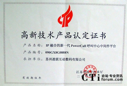 CTI論壇(ctiforum)4月20日消息(記者 楊毅):近日,蘇州盈聯(lián)互動數(shù)碼有限公司榮獲江蘇省科學技術廳頒發(fā)的高新技術產(chǎn)品認定證書,這標志著盈聯(lián)作為一家專業(yè)的呼叫中心解決方案提供商,其產(chǎn)品的先進性和高品質已獲得了中國技術部門的官方認可。CTI論壇報道