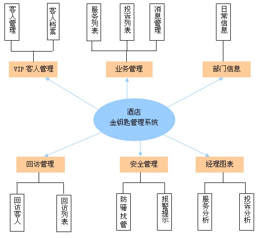 酒店金鑰匙管理系統(tǒng)通過(guò)客房電話(huà)與客人管理信息系統(tǒng)的結(jié)合,實(shí)現(xiàn)了酒店對(duì)在住客人服務(wù)事務(wù)的管理,最大限度地提高了酒店的服務(wù)效率、滿(mǎn)足客人的服務(wù)需求。系統(tǒng)包括VIP客人管理、業(yè)務(wù)管理、部門(mén)管理、回訪管理、安全管理、經(jīng)理圖表六大功能模塊,體系結(jié)構(gòu)如下: