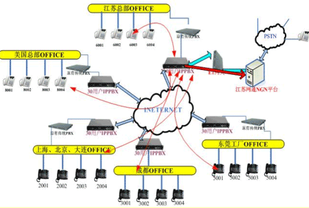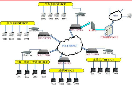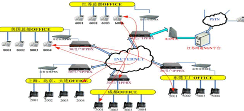 各地的IPPBX會自動識別輸入的號碼,并且通過網(wǎng)絡(luò)把號碼送到蘇州總部的1200交換機(jī),江蘇的1200交換機(jī)已經(jīng)通過E1與江蘇網(wǎng)通的NGN服務(wù)器對接。網(wǎng)通收到你輸入的被叫號碼,即發(fā)出呼叫,完成你的一次呼叫。如果有新辦事處成立,只要有網(wǎng)絡(luò),可不用申請當(dāng)?shù)氐碾娫捑路也可實(shí)現(xiàn)輕松辦公。