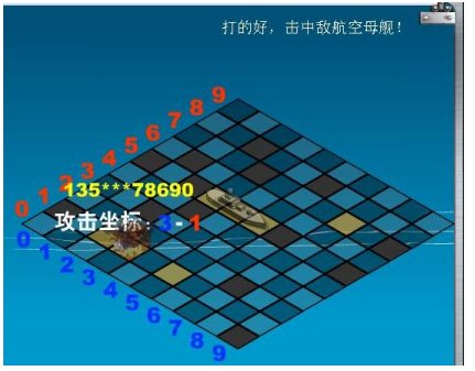 這里是游戲的主戰(zhàn)場(chǎng),觀眾每發(fā)送一個(gè)轟炸坐標(biāo)過來,都會(huì)在這里有體現(xiàn)。如轟炸者的手機(jī)號(hào)、攻擊坐標(biāo)、是否擊中(擊中是一團(tuán)火光,未擊中則是水花)、及語音及文字提示。