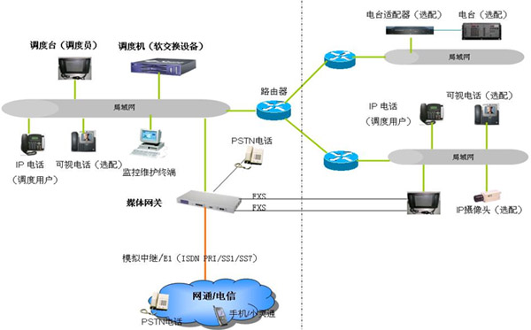 IP指揮調(diào)度語音通信系統(tǒng)由調(diào)度機(jī)、調(diào)度臺、媒體網(wǎng)關(guān)、IP電話、電臺適配器、電臺等設(shè)備組成,整體系統(tǒng)采用軟交換網(wǎng)絡(luò)的結(jié)構(gòu),構(gòu)建于以太網(wǎng)之上。傳輸網(wǎng)絡(luò)由通過路由器連接的多個(gè)局域網(wǎng)構(gòu)成;