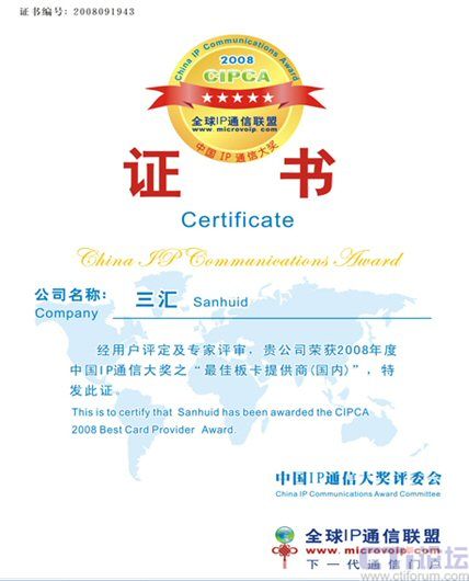 9月19日,在上海盛大舉行的CIPCC中國(guó)IP通信大會(huì)上,杭州三匯摘取了CIPCA 2008年國(guó)內(nèi)最佳語(yǔ)音板卡提供商大獎(jiǎng),體現(xiàn)了杭州三匯在國(guó)內(nèi)語(yǔ)音卡領(lǐng)域的絕對(duì)領(lǐng)導(dǎo)和優(yōu)勢(shì)地位。