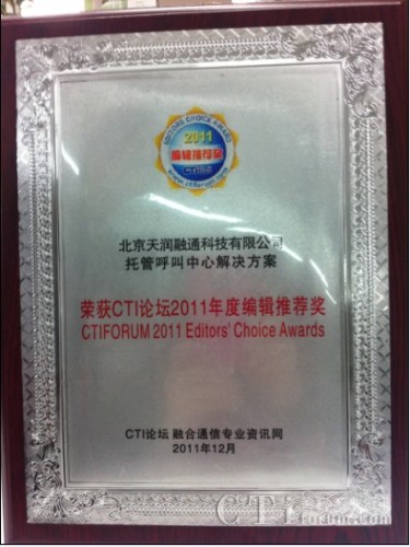 CTI論壇(ctiforum)1月13日消息(記者 潘婷婷): 近日, CTI論壇舉辦的“CTI論壇2011年度編輯推薦獎(jiǎng)”評(píng)選活動(dòng)落下帷幕,天潤融通的解決方案成功斬獲了CTI論壇編輯推薦獎(jiǎng)。CTI論壇報(bào)道