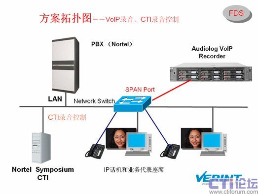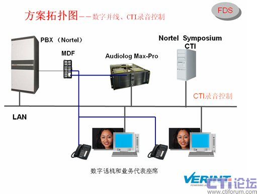 Audiolog錄音系統(tǒng)能和Nortel交換機、Symposium CTI進行整合,獲取CTI隨路數(shù)據(jù)便于用戶錄音資料檢索。
