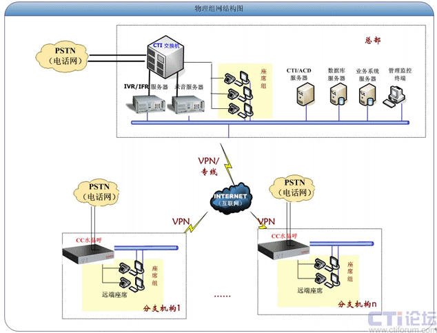 BasicCall和CrystalCall的聯(lián)網(wǎng)應(yīng)用多出現(xiàn)在總部和分支機構(gòu)中。在中心總部建設(shè)一套強大的呼叫中心系統(tǒng),在分支結(jié)構(gòu)建設(shè)獨立的呼叫中心系統(tǒng),中心與各分支結(jié)構(gòu)之間聯(lián)網(wǎng),中心能夠?qū)Ω鞣种ЫY(jié)構(gòu)的數(shù)據(jù)進行統(tǒng)一的監(jiān)控和管理。同時分支結(jié)構(gòu)能夠?qū)χ苯訐艽虮痉⻊?wù)電話的客戶進行統(tǒng)一的管理,把所有的電話都納入呼叫中心的范疇,統(tǒng)一提供服務(wù)。實現(xiàn)總部和中心之間的“松散建設(shè)、緊密管理”。圖 呼叫中心系統(tǒng)物理拓撲圖