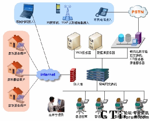 隨著國內(nèi)城市化地不斷加快,人口老齡化的加劇,人民群眾對家政服務需求也越來越旺盛,家政服務業(yè)的重要性也日益凸顯。為了規(guī)范家政服務市場、整合家政市場資源、培育家政服務示范性企業(yè),國家商務部、財務部于2009年4月下發(fā)了《關(guān)于推進家政服務網(wǎng)絡體系建設(shè)的通知》的149號文件,啟動了家政服務網(wǎng)絡中心體系建設(shè)的項目,并提出了具體的規(guī)范和要求。以此為起點,為更好地服務社會滿足人民群眾日益增長的生活需求而努力。自文件下發(fā)以來,我公司就組織專門的項目組,對家政服務行業(yè)具體業(yè)務需求的調(diào)研以及開發(fā)工作。公司利用多年的開發(fā)經(jīng)驗,經(jīng)過幾個月的努力,終于在8月份完成了暢信達家政服務網(wǎng)絡中心的全套建設(shè)方案。與其它系統(tǒng)固化的功能設(shè)計不同,該方案可以靈活地定制業(yè)務模塊,方便各地的家政公司根據(jù)本市的情況和需求,確定適合自身的業(yè)務流程。系統(tǒng)業(yè)務模塊完整地覆蓋了家政服務的業(yè)務范圍與重點。并將家政服務的業(yè)務分為營業(yè)系統(tǒng)、賬務系統(tǒng)、后臺系統(tǒng)等部分,貫穿了市民從訴求提交、工單派發(fā)、工單處理、財務結(jié)算到回訪反饋的各個方面。系統(tǒng)還提供了完善的報表模塊準確反映業(yè)務和系統(tǒng)運營狀況,有力地支持對平臺進行運營管理工作。另外在方案設(shè)計上,除了滿足業(yè)務處理需要外,還充分考慮到系統(tǒng)的適應性、穩(wěn)定性和處理的能力。首先為了滿足各地市對家政平臺的不同需求,公司專門推出了基于IBM服務器的和暢信達標配服務器的兩種建設(shè)方案。暢信達標配服務器方案可提供最低4模擬外線最多1條數(shù)字中繼(E1)接入,適用于初期規(guī)模較小且投資規(guī)模不大的客戶。而基于IBM服務器的方案,則主要是滿足業(yè)務量較大,同時對設(shè)備配置要求高的城市,以數(shù)字線接入為主。多種建設(shè)模式充分體現(xiàn)了方案的靈活性、可擴展性的特征,有效地減少了運營風險,提升了個性化定制化服務的水平。其次,根據(jù)家政市場需求預測以及已開通家政服務網(wǎng)絡中心城市的實際運營情況,一個中型城市,預計電話開通之后,話務量平均每天近3000個,這就要求系統(tǒng)不但有穩(wěn)定的性能而且要有強大的處理能力。我公司從系統(tǒng)平臺構(gòu)建、業(yè)務流程設(shè)計、設(shè)備性能、組網(wǎng)設(shè)計等方面著手,為系統(tǒng)提供了足以確保安全穩(wěn)定運行的支持。青島暢信達通信有限公司家政服務網(wǎng)絡中心方案架構(gòu)圖