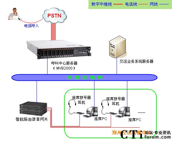 鄭州交通運(yùn)輸集團(tuán)有限責(zé)任公司,是河南省規(guī)模最大的道路運(yùn)輸企業(yè),目前有員工8300多人,企業(yè)總資產(chǎn)15億元。是一家集公路客貨運(yùn)輸、現(xiàn)代物流、出租車運(yùn)輸、汽車貿(mào)易、汽車維修、房地產(chǎn)開(kāi)發(fā)、旅游旅棧餐飲、燃潤(rùn)料和汽車配件銷售、商品批發(fā)、印刷業(yè)、信息傳媒業(yè)、駕駛員培訓(xùn)、投資建設(shè)、物業(yè)管理等多元化經(jīng)營(yíng)為一體的大型企業(yè)集團(tuán)。鄭州交運(yùn)服務(wù)熱線采用暢信達(dá)通信MVB2000系統(tǒng)作為交換平臺(tái),采用企業(yè)級(jí)智能路由語(yǔ)音網(wǎng)關(guān)結(jié)合話機(jī)作為座席終端,系統(tǒng)共接入數(shù)字中繼線4條(4E1),座席分機(jī)90臺(tái),系統(tǒng)通過(guò)內(nèi)部局域網(wǎng)組網(wǎng),系統(tǒng)架構(gòu)形式如下:
