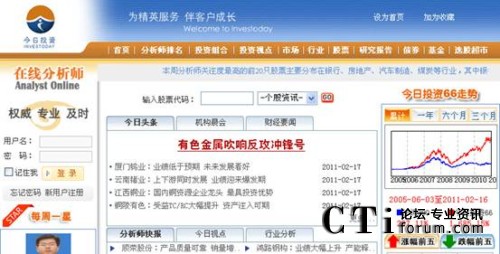 深圳今日投資財經(jīng)資訊有限公司是一家致力于為投資者提供專業(yè)證券數(shù)據(jù)統(tǒng)計和個性化證券資訊的服務提供商。今日投資按照國際標準對70余家券商研究所,1800名一線分析師的研究成果進行深入加工和數(shù)據(jù)提煉,經(jīng)過多年的積累,建立了國內最早、最全、最專業(yè)的證券投資分析數(shù)據(jù)庫,并充分借鑒國內外先進的投資方法,獨創(chuàng)出三眼投資統(tǒng)計分析法,分別從基本面、技術面、機構認同度三個方面,對個股、行業(yè)、市場進行各種綜合數(shù)據(jù)統(tǒng)計和研究分析,依托強大的網(wǎng)絡資源和合作渠道,通過互聯(lián)網(wǎng)、移動互聯(lián)網(wǎng)、手機增值業(yè)務、雜志媒體、電視媒體、廣播電臺等渠道為投資者提供各具特色的專業(yè)數(shù)據(jù)統(tǒng)計和個性化證券資訊服務。目前今日投資的產(chǎn)品有:在線分析師、好股網(wǎng)、金融E家、上市公司市值管理系統(tǒng)、手機炒股系統(tǒng)、行情分析師、基金經(jīng)理調查、證券導刊等。CTI論壇編輯