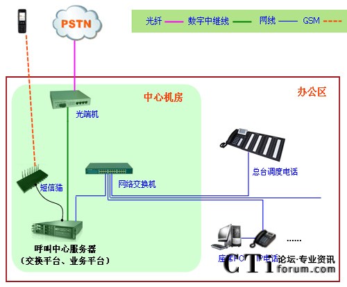 維佳元創(chuàng)呼叫中心系統(tǒng)采用暢信達通信呼叫中心交換平臺與業(yè)務平臺,采用1路E1數(shù)字中繼線接入,對外公布一個400號碼與10多個辦公電話號碼,采用IP話機作為總臺調(diào)度電話、座席電話與辦公電話,系統(tǒng)架構形式如下: