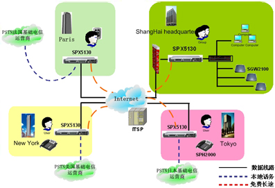 隨著公司在全世界開設(shè)眾多的部門,IP電話技術(shù)將會是不同分公司之間實現(xiàn)低費用高品質(zhì)語音通訊的方式。SINOCO公司的IP-PBX 系統(tǒng)解決方案,利用 SPX-5130設(shè)備通過互連網(wǎng)連接到公司的各個分支機構(gòu),提供分級體系結(jié)構(gòu),更進一步提供了可靠的,靈活的語音通訊解決方案,從而滿足公司快速回應(yīng)客戶的需求。同時,它也降低了總部和分部之間的電話費用。總部和分部間昂貴的國際電話費用將不再存在, 而且享受高品質(zhì)的語音通訊質(zhì)量。