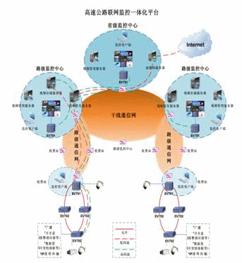 該系統(tǒng)集數(shù)字視頻傳輸、視頻管理、視頻存儲以及外網(wǎng)發(fā)布等功能為一體。 EV701中心設(shè)備有4個業(yè)務槽,可任意插拔編解碼卡,最多支持8路視音頻數(shù)據(jù)。采用H.264編碼標準的EV702外場綜合接入設(shè)備,將原來外場分散的攝像頭、快球、云臺、可變情報板、報警感應器等設(shè)備融為一體,同時也支持MPEG編碼標準的視音頻接入。可以同時編碼2路以上的視音頻信號,支持雙流傳輸,D1數(shù)據(jù)用于實時觀看,CIF數(shù)據(jù)用于存儲和Web網(wǎng)業(yè)務(包括對外發(fā)布實時圖像和管理人員異地監(jiān)控)。具備IP開關(guān)斷功能,減輕了通信網(wǎng)絡的壓力。 路級中心、區(qū)域中心、省級中心分布式多級監(jiān)控,由省中心統(tǒng)一設(shè)定權(quán)限,進行集中管理。