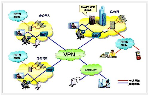 FreePP獨有的群組功能可以幫助企業(yè)將其總部與分支機構原本各自獨立的若干個PBX整合成為一個PBX,實現Internet、PSTN網絡上通信應用的融合,幫忙企業(yè)擺脫對傳統(tǒng)通信運營商的依賴,完全掌握自己的通信網絡。通過為PBX外線上的若干個FreePP Box (或MPES)分配一個Group Number,PBX內線上的分機按照PBX上的設定來獲取Group Number中的一個FreePP Box,進而通過這個FreePP Box來呼叫另外一組Group Number 連接的PBX分機號碼。他們相互間的通信完全基于Internet實現,無需象傳統(tǒng)方式那樣交納通信費用。