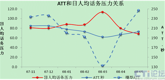 若ATT只受話務(wù)壓力影響,兩者關(guān)系應(yīng)出現(xiàn)下圖虛線描述的模型ATT形狀,而事實(shí)ATT的波幅相對小很多,說明ATT還受到其它諸多因素的制約。(圖1)