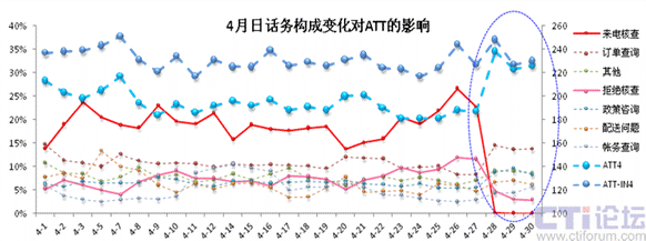 從圖12也可以明顯的看出:ATT“月末彈起”現(xiàn)象的原因同樣是“簡單話務(wù)比例的下降必然帶來整體ATT的上升;復(fù)雜話務(wù)比例的上升也必然帶來整體ATT的上升”;具體因?yàn)锳von調(diào)整了業(yè)務(wù)政策,從3月開始,每月27日18:00后至月末NCC不受理來電核查,因此該類話務(wù)從27日的25%左右突降為0;拒絕核查的量比也有-7%的大幅下降(從12%下降到5%以下);而復(fù)雜業(yè)務(wù)如政策咨詢、配送問題則有+6%的較大幅度上升(約從10%上升到16%)。