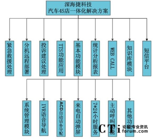 針對(duì)目前國(guó)內(nèi)汽車(chē)4S店的服務(wù)現(xiàn)狀,并結(jié)合4S店需求的獨(dú)特特點(diǎn),專為國(guó)內(nèi)汽車(chē)4S店量身打造的深海捷汽車(chē)4S店聯(lián)絡(luò)中心系統(tǒng),除具備呼叫中心基本功能外,還集成了分機(jī)遠(yuǎn)程部署、TTS功能、緊急救援處理模塊、投訴/建議受理模塊、WEB CALL模塊和短信平臺(tái)模塊等特色功能?傮w功能結(jié)構(gòu)圖如下: