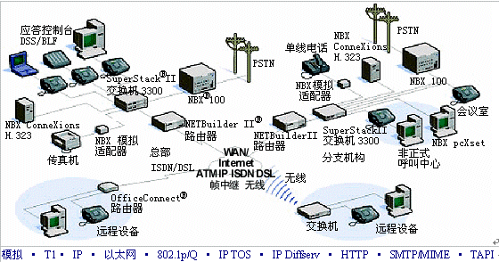 使用標(biāo)準(zhǔn)多協(xié)議路由器,諸如3Com PathBuilder或NET Builder II路由器,您能夠通過廣域網(wǎng)或Internet將多個(gè)分支機(jī)構(gòu)與您的總部系統(tǒng)相連接。您可以隨意選擇網(wǎng)絡(luò): 支持工業(yè)標(biāo)準(zhǔn)Internet協(xié)議(IP)聯(lián)網(wǎng)的DSL、電纜、幀中繼或ISDN。您甚至能夠通過使用3Com NBX ConneXtions H.323網(wǎng)關(guān)應(yīng)用,來充分利用低成本、高質(zhì)量的IP語音 (VoIP) H.323服務(wù)。因?yàn)镹BX ConneXtion使用Internet作為長途線路上本地到本地的撥號(hào)路徑,因此它能夠以極低的成本提供傳統(tǒng)電話專用線路和后端分機(jī)(OPX)線路的優(yōu)勢(shì)。