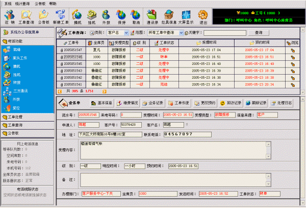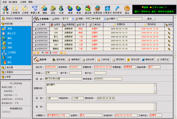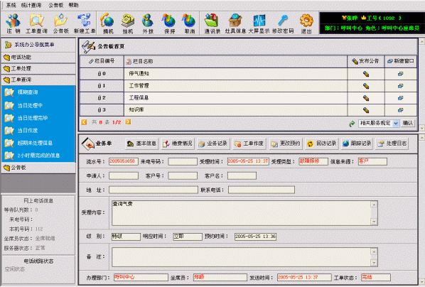 系統(tǒng)聯(lián)通了座席員、營業(yè)廳業(yè)務員、工程管理人員、維修網(wǎng)點派工人員、外勤維修人員、公司管理人員等各種角色使用系統(tǒng)的界面。