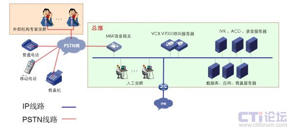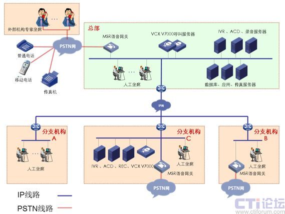 分支機(jī)構(gòu)B:網(wǎng)絡(luò)通過VPN技術(shù)與總部實(shí)現(xiàn)數(shù)據(jù)語音傳輸,部署MSR語音網(wǎng)關(guān)與當(dāng)?shù)豍STN網(wǎng)連接,IP坐席。兩地申請相同的客服號(hào)碼,兩地內(nèi)撥打客服號(hào)碼,客戶無長途話費(fèi)產(chǎn)生。適用與總部與分支處在不同省市。