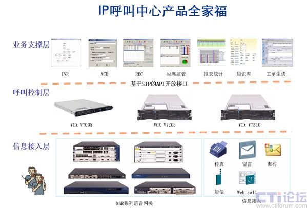 3、“信息接入層”通過PSTN(MSR)、短信、郵件、留言、WEB CALL等信息通訊手段,使傳統(tǒng)的語音呼叫中心便捷的擴(kuò)展為多媒體的呼叫中心。