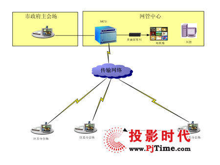 傳輸網(wǎng)絡采用4M專線,整個系統(tǒng)由控制中心、市政府主會場和18個區(qū)縣分會場組成,在控制中心配置MCU、網(wǎng)管和電視墻多畫面顯示單元,通過網(wǎng)管對系統(tǒng)實行設備的統(tǒng)一管理和會議資源的統(tǒng)一調(diào)度,控制中心配置18路電視墻集中顯示單元,通過電視墻,可實時監(jiān)看18個區(qū)縣分會場情況。在市政府主會場和18個區(qū)縣分會場,各會場配置1套高清晰視頻會議終端,各會場終端4M專線接入控制中心,實現(xiàn)全市電子政府的視頻會議系統(tǒng)。系統(tǒng)建設完成后,可實現(xiàn)導演控制、主席控制、點名發(fā)言、會場輪巡、攝像機遠控、電視墻、多畫面、多方混音等視頻會議系統(tǒng)功能。