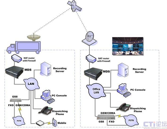 Zed-3的車載調(diào)度系統(tǒng)支持多種接口,通過(guò)無(wú)線網(wǎng)關(guān)提供的GSM、CDMA或模擬中繼端口,可以實(shí)現(xiàn)與固定電話、手機(jī)等外部電話的互通。即使在現(xiàn)場(chǎng)沒(méi)有任何可用的外線資源,例如沒(méi)有模擬電話接口,手機(jī)卡沒(méi)有信號(hào),也仍然可以通過(guò)衛(wèi)星鏈路將呼叫連接到指揮中心的網(wǎng)關(guān)設(shè)備再落地,最大可能的保證現(xiàn)場(chǎng)調(diào)度系統(tǒng)與外部電話的通信。
