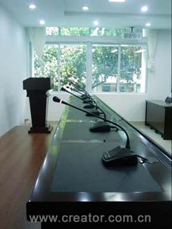 所以在本會(huì)議室配置了1臺(tái)標(biāo)準(zhǔn)的會(huì)議討論型控制主機(jī)臺(tái)CR-M4101,1臺(tái)座式的主席機(jī)CR-M4102B,9臺(tái)座式的會(huì)議代表機(jī)CR-M4104B,另外還有連接電纜等。主席機(jī)具優(yōu)先控制權(quán),設(shè)置主席位置,并且可以移動(dòng),代表機(jī)分別設(shè)置其余數(shù)個(gè)話筒點(diǎn)。采用手拉手方式,一條總線即可連接所有會(huì)議討論設(shè)備,布線簡(jiǎn)單快捷。通過(guò)專業(yè)的音頻輸出口和音響擴(kuò)聲系統(tǒng)結(jié)合,清晰、明亮的將發(fā)言人的聲音重放出來(lái)。