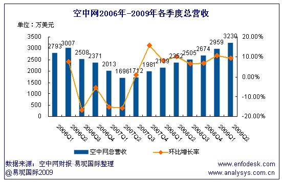 空中網(wǎng)發(fā)布了截至6月30日的2009年第2季度未經(jīng)審計(jì)財(cái)報(bào)。報(bào)告顯示,空中網(wǎng)第2季度總營收為3230萬美元,同比增長37%,比上一季度增長9%;按照美國通用會(huì)計(jì)準(zhǔn)則,空中網(wǎng)第2季度凈利潤為355萬美元,高于同年第1季度103萬美元。
