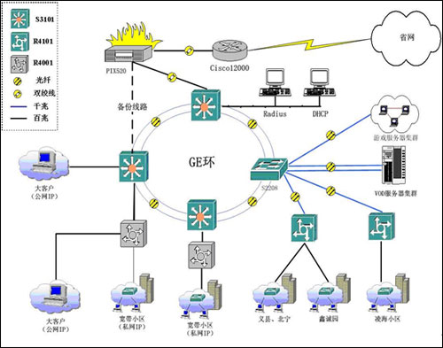 此城域網(wǎng)結構清晰,由核心層的三層交換機只負責數(shù)據(jù)的快速轉發(fā),對業(yè)務匯聚和用戶的認證控制任務全部由接入服務器R4000來完成。要求接入服務器支持多種認證手段、加強對各類用戶實現(xiàn)不同級別的控制、為用戶的訪問提供安全保障措施、結合Radius系統(tǒng)提供多種計費功能。