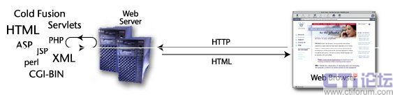 在互聯(lián)網(wǎng)上,瀏覽器通過Internet協(xié)議――比如HTTP――向Web服務(wù)器發(fā)出請(qǐng)求,而Web服務(wù)器上存放著靜態(tài)頁面和動(dòng)態(tài)應(yīng)用,它們將把HTML返回給瀏覽器,最終結(jié)果在瀏覽器中展現(xiàn)出來。如下圖所示: