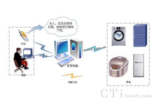 家電遠控系統(tǒng)的原理是利用電腦或者手機的電源管理系統(tǒng),來管理用戶終端軟件管理電源的開關(guān)、定時、預(yù)設(shè)時間等,利用互聯(lián)網(wǎng)或者手機網(wǎng)絡(luò)把信號傳輸?shù)郊彝ル娔X,家庭電腦當作小型服務(wù)器或者信號轉(zhuǎn)發(fā)點,把信號利用藍牙、zigbee、wifi等無線傳輸?shù)街付ǖ碾娫床遄斎幻總電源插座都要有相應(yīng)的信號接收模塊實現(xiàn)和家庭電腦的信號傳輸,實現(xiàn)了對電源的管理功能。家電遠控終端軟件嵌入語音合成軟件,利用合成語音報讀預(yù)設(shè)的提醒內(nèi)容和時間提醒,具有危急情況下的報警功能。當然如果我們是在家里,可以直接用手機通過藍牙對電源插座進行管理,或者通過家庭電腦進行管理。如圖所示: