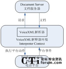 VoiceXML解析器上下文和VoiceXML解釋器負責(zé)解析VoiceXML文件,控制執(zhí)行平臺。執(zhí)行平臺提供合成語音的輸出(text to