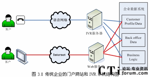 隨著Internet和Web技術(shù)的迅速發(fā)展,越來的企業(yè)開始建立自己的門戶網(wǎng)站,同時(shí)又擁有自己的IVR系統(tǒng)(如圖3.8所示),但是兩套系統(tǒng)完全獨(dú)立,語音系統(tǒng)和數(shù)據(jù)系統(tǒng)沒有任何交互或者只有很少的交互。而建立IVR系統(tǒng)的目標(biāo)就是給客戶更好的體驗(yàn),使客戶能方便的通過電話完成更多以前需要登陸企業(yè)門戶網(wǎng)站,或者親自去企業(yè)或其網(wǎng)點(diǎn)去辦理的業(yè)務(wù),這就需要IVR系統(tǒng)能跟后臺(tái)數(shù)據(jù)系統(tǒng)有更多更好的交互。“語音門戶”的概念出現(xiàn)也愈發(fā)的證明這一點(diǎn)。