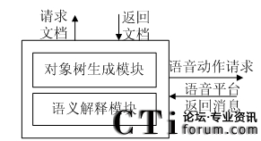 作為VoiceXML語言的解釋工具,文檔解析是VoiceXML解析器主要任務(wù),也是執(zhí)行引擎的重要組成部分,文檔解析的內(nèi)容決定了執(zhí)行平臺(tái)的下一步操作,也是整個(gè)系統(tǒng)運(yùn)行的核心。因?yàn)閂oiceXML文檔首先是一個(gè)XML文檔,所以主要包含對(duì)象樹生成模塊和語義解釋模塊兩個(gè)部分。其中對(duì)象樹生成模塊是對(duì)VoiceXML文檔進(jìn)行XML方式的解析,解釋模塊使用FIA算法對(duì)生成的對(duì)象進(jìn)行解析。圖3.13描述了VoiceXML解析器文檔解析的模型。