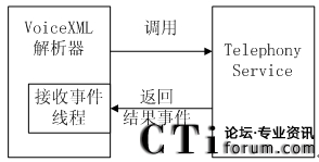 當(dāng)VoiceXML解析器做完解析工作之后,遇到需要語音操作時(shí),就得依靠調(diào)用Telephoney API來完成,同時(shí)Telephony Service需要向VoiceXML解析器去返回相應(yīng)的語音操作結(jié)果事件。圖3.15描述了這一過程。