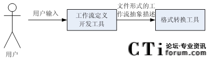 IVR系統(tǒng)的過程定義工具是一個(gè)可視化的軟件工具,它主要用于定義工作流模型中各個(gè)活動(dòng)之間的關(guān)系[22]。工作流程過程定義向用戶提供對(duì)實(shí)際業(yè)務(wù)處理過程分析、建模的手段。其輸入輸出可以用圖3.2表達(dá):