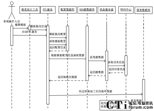 在ETL服務(wù)運(yùn)行時(shí),首先它會(huì)從配置數(shù)據(jù)庫(kù)中獲取模板的配置信息,并且根據(jù)其配置信息從ODS源數(shù)據(jù)庫(kù)中抽取數(shù)據(jù)。ODS源數(shù)據(jù)庫(kù)中的數(shù)據(jù)是狀態(tài)服務(wù)器從呼叫中心中獲得的。在ETL抽取數(shù)據(jù)后對(duì)其進(jìn)行轉(zhuǎn)換和加工,將其加載到報(bào)表數(shù)據(jù)庫(kù)中。并利用報(bào)表展現(xiàn)工具將報(bào)表數(shù)據(jù)展現(xiàn)出來。其最終設(shè)計(jì)的系統(tǒng)各部件交互時(shí)序圖如圖3.5所示。