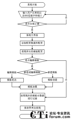 根據(jù)流程圖,使用者在進(jìn)入系統(tǒng)時(shí)需要輸入用戶名和密碼以及要連接的ODS數(shù)據(jù)源的IP和端口。如果信息正確,則進(jìn)入到報(bào)表系統(tǒng)主界面。然后報(bào)表設(shè)計(jì)工具會(huì)從配置數(shù)據(jù)庫(kù)中讀取報(bào)表模板配置,再將現(xiàn)在統(tǒng)計(jì)數(shù)據(jù)的報(bào)表模板信息展現(xiàn)出來。