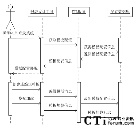 基于以上軟件體系結(jié)構(gòu),在系統(tǒng)操作人員利用報(bào)表設(shè)計(jì)工具編輯模板時(shí),報(bào)表設(shè)計(jì)工具將模板修改信息發(fā)送給ETL服務(wù),ETL服務(wù)會(huì)將修改配置數(shù)據(jù)庫(kù)中的模板配置。