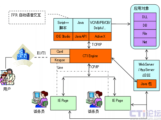IVR部分,編寫Script++腳本程序或VC/VB/Delphi/PB/Java應(yīng)用程序控制電路的接續(xù)以及放音、錄音收碼、轉(zhuǎn)移等。CTI論壇報道