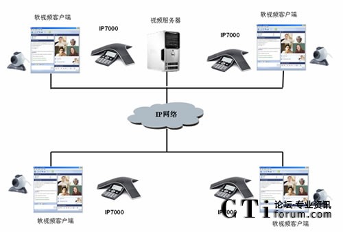 用戶現(xiàn)階段采用V2軟件視頻會議系統(tǒng),但現(xiàn)有的設(shè)備無法解決大型會議室的聲音處理問題。故新增PolycomSoundStation IP 7000音頻會議終端,并通過Polycom專有的計(jì)算機(jī)呼叫工具包使其與PC機(jī)相連,解決V2的軟件視頻會議系統(tǒng)大型會議室的聲音處理問題。