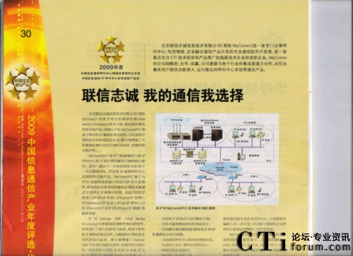 CTI論壇(ctiforum)11月24日消息(記者 張塵):日前,在中國(guó)計(jì)算機(jī)報(bào)社開展了2009年度中國(guó)信息通信產(chǎn)業(yè)年度獎(jiǎng)項(xiàng)評(píng)選活動(dòng),北京聯(lián)信志誠(chéng)信息技術(shù)有限公司(簡(jiǎn)稱“MyComm公司”)憑借領(lǐng)先的IP語音通信技術(shù)優(yōu)勢(shì),以其長(zhǎng)久以來業(yè)界口碑和今年所取得優(yōu)秀業(yè)績(jī),榮獲2009年度中國(guó)信息通信呼叫中心領(lǐng)域領(lǐng)軍企業(yè)獎(jiǎng)和2009年度中國(guó)信息通信IP呼叫中心優(yōu)秀創(chuàng)新產(chǎn)品獎(jiǎng)。CTI論壇報(bào)道