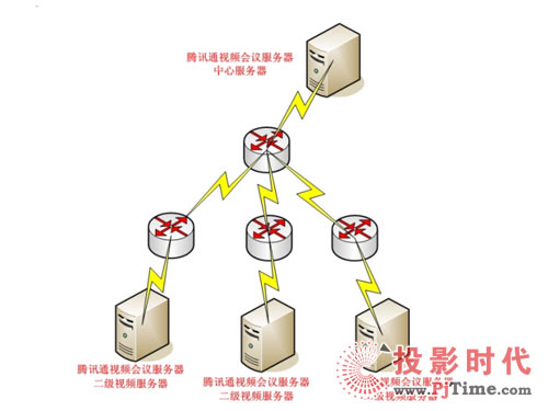 整套視頻系統(tǒng)基于原有IP數(shù)據(jù)網(wǎng)絡(luò),在中心機(jī)房建立視騰訊通視頻系統(tǒng)中心服務(wù)器,負(fù)責(zé)二級服務(wù)器的連接及控制,用戶數(shù)據(jù)和會議數(shù)據(jù)采用虛擬服務(wù)器管理技術(shù),即在不同的虛擬服務(wù)器的用戶和會議數(shù)據(jù)不能相互看到,當(dāng)需要召集不同虛擬服務(wù)器用戶的會議時通過管理員進(jìn)入后臺召集跨虛擬服務(wù)器的會議,以實現(xiàn)各個單位之間的大會議的需求。這樣既能快速召開部門內(nèi)小型視頻會議,同時又能分別在各省市支部召開區(qū)域型的大型會議。