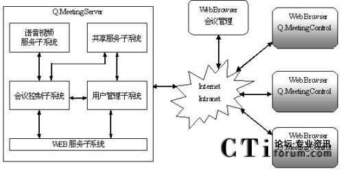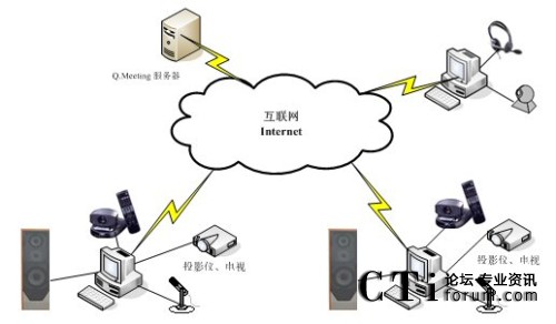 系統(tǒng)選用北京億方連線通訊技術有限公司具有國際先進水平的全新第四代網絡視頻協作會議中心Q.Meeting為核心進行構建,該系統(tǒng)由會議服務器Q.Meeting Server和基于IE 瀏覽器的客戶端組成。Q.Meeting Server運行于一臺服務器上,構成網絡會議中心,提供會議控制、視頻服務、語音服務、共享服務、WEB服務和會議用戶管理等功能。所有參加會議的人員只需通過IE瀏覽器訪問會議中心網站就可以參加會議,通過訪問會議頁面和嵌于其中的客戶端插件Q.Meeting Control實現音頻和數據共享等交流。